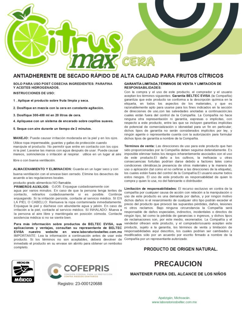Citrus Max Cera es un aditivo de alta calidad diseñado para optimizar el proceso de tratamiento de frutos cítricos en postcosecha. Formulado con parafinas y aceites hidrogenados, actúa como un antiadherente eficaz que facilita un acabado impecable.