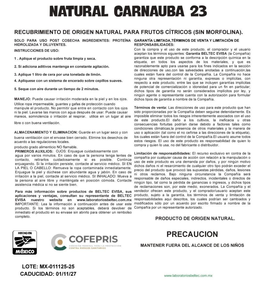 Natural Carnauba 23 es un recubrimiento de origen natural diseñado para la protección postcosecha de frutos cítricos. Su fórmula destaca por ser libre de morfolina, lo que la hace ideal para procesos que requieren ingredientes más limpios y naturales.
