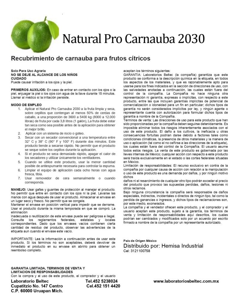 Natural Pro Carnauba 2030 es un recubrimiento especializado de uso agrario diseñado para proteger y mejorar la apariencia estética de los frutos cítricos en postcosecha. Su fórmula proporciona un brillo superior y una barrera protectora duradera.